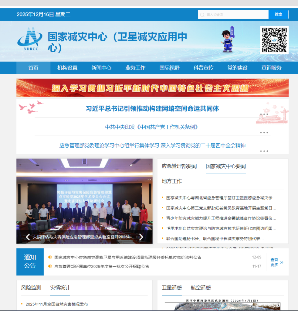 The National Disaster Reduction Center of the Ministry of Civil Affairs of the People’s Republic of China was established in April 2002 and joined the “Ministry of Civil Affairs Satellite Disaster Reduction Application Center” brand in February 2009.The center mainly undertakes the data and information management of disaster reduction and relief,disaster and risk assessment,product and service, space science and technology application,science and technology and policy research,technology equipment and supplies research,publicity and education,training and international exchange and cooperation and other functions,proving information service,technical support and decision-making advice for the government’s disaster reduction and relief work.