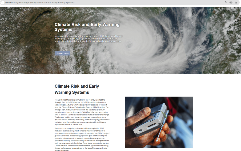 Furthermore, the ongoing review of the Meteorological Act 2015, motivated by the evolving needs since its inception and the aim to incorporate commercialization aspects, is pivotal for the CREWS project’s goals in Seychelles. By addressing legislative gaps and facilitating the generation of revenues, this review is expected to strengthen the operational capacity and sustainability of climate risk management and early warning systems in Seychelles. These steps, supported under the CREWS initiative, underscore a comprehensive approach to enhancing climate resilience and preparedness in the face of increasing climate-related challenges.