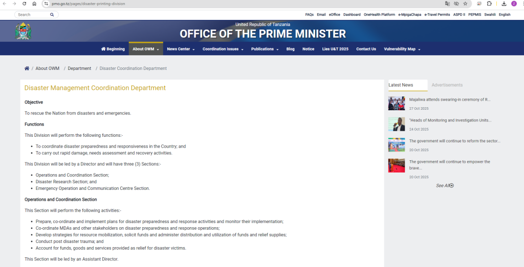 Receive, analyse and disseminate disaster emergency information from within and outside Tanzania;