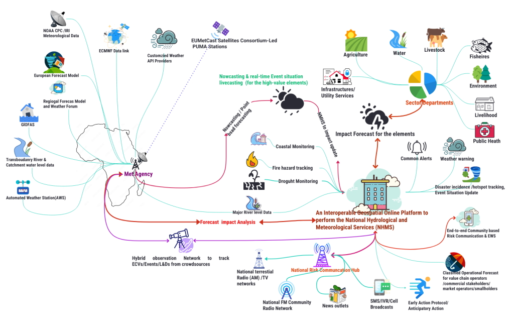 The geospatially enabled MHEWC platform strengthens the interconnectedness between climate-vulnerable sector agencies, diverse stakeholders, value chain actors, and frontline communities, enabling seamless interaction within a unified system. It supports the functionalization of integrated national hydrometeorological services (NHMS), enabling weather-impact forecasting by sector agencies, operational forecasting, standardized alerting, and real-time event updates.